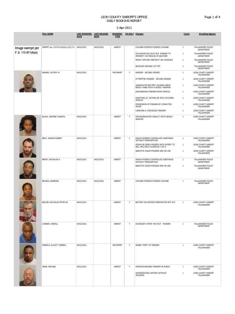 Attached is a PDF file containing all bookings at the Leon County Detention Facility from October 31 2017. Change language content. Leon county booking report november 1 2019 0 ratings0 found this document useful 0 votes11K views2 pages FULL NAMELAST BOOKING DATELAST RELEASE DATEBOOKING TYPEIN JAILCharges CountArresting Agency COOK STACI SHEVON 11212021ARRESTYPETIT THEFT1TALLAHASSEE POLICE DEPARTMENTDAVIS SANTRAY.